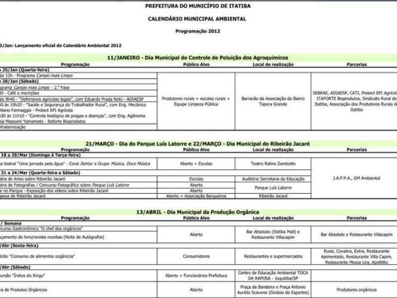 Segundo a Prefeitura de Itatiba, ao longo do ano, um Calendário especial, apresentado na segunda-feira, dia 23 janeiro, no Paço Municipal, convida os Itatibenses para pensar e praticar ações de conscientização ambiental.