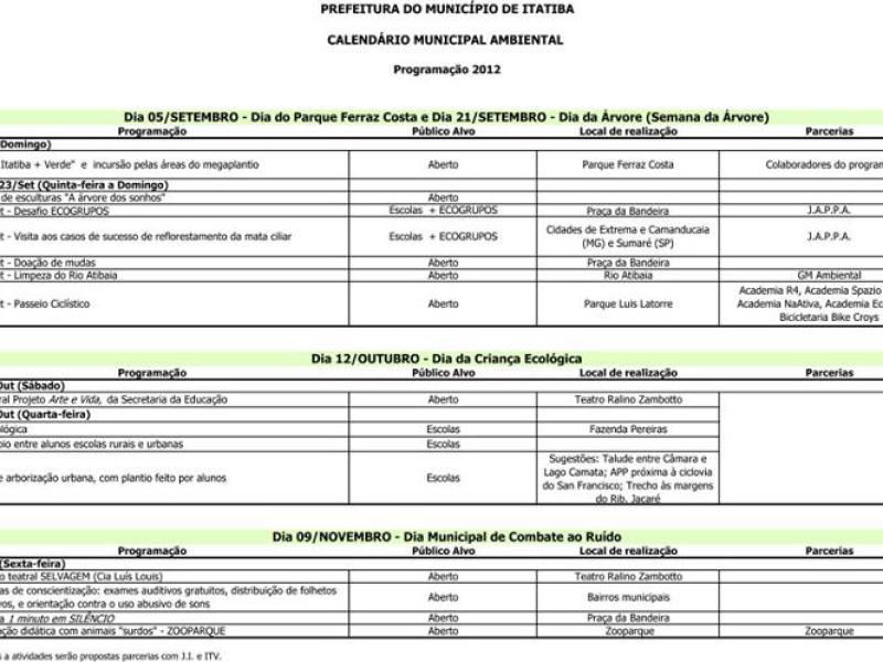 Segundo a Prefeitura de Itatiba, ao longo do ano, um Calendário especial, apresentado na segunda-feira, dia 23 janeiro, no Paço Municipal, convida os Itatibenses para pensar e praticar ações de conscientização ambiental.