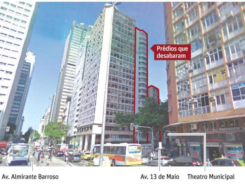 Os três prédios localizados ao lado do Theatro Municipal desabaram por volta das 20h30. O teatro não foi atingido, mas seu anexo, onde funciona a bilheteria, sofreu danos por causa dos escombros.