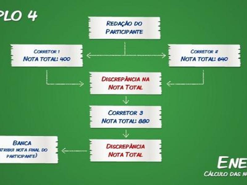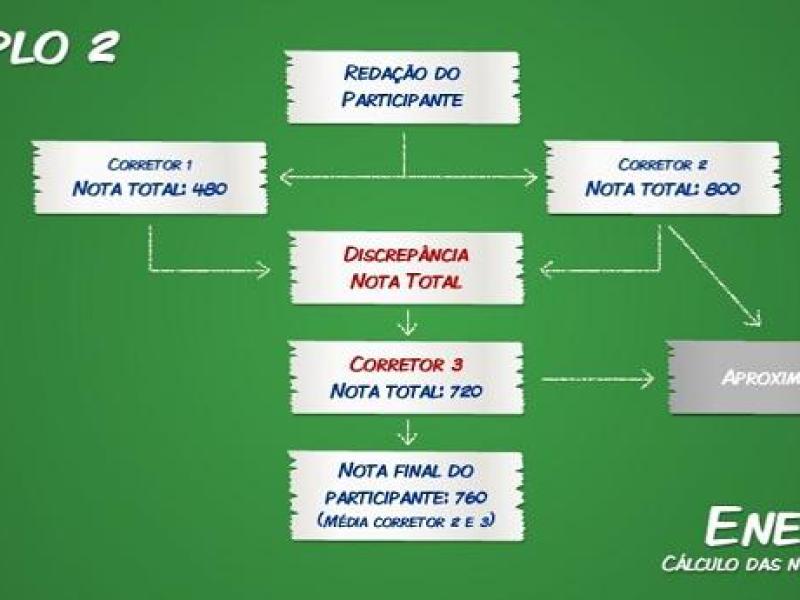 Na prova deste ano, dois corretores, a princípio, olham a redação do candidato. Se a diferença entre a nota final deles for superior a 200 pontos na nota total ou de 80 pontos em cada uma das competências, um terceiro corretor entra em cena. A nota final será a média aritmética simples das menções “mais próximas”.