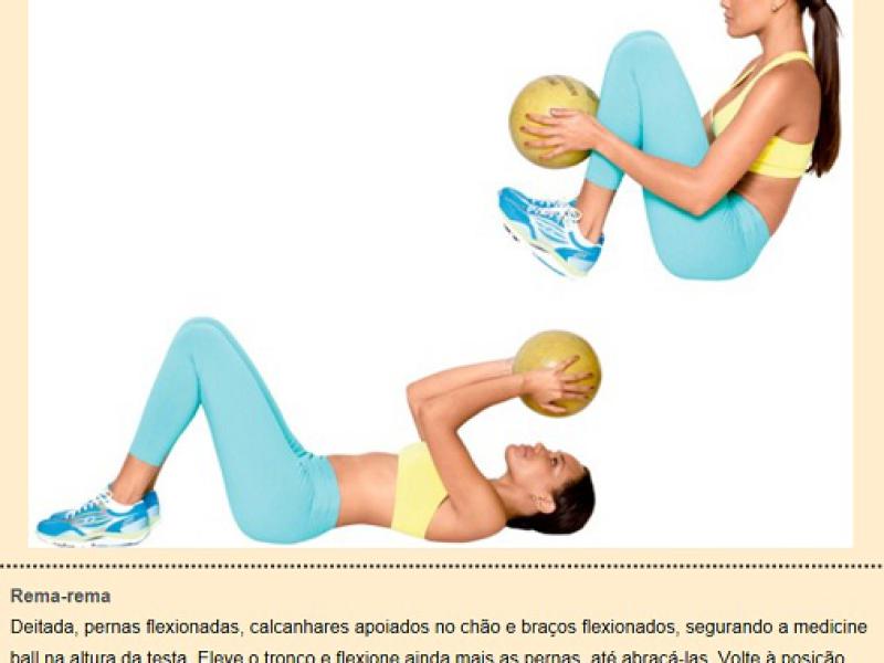Deitada, pernas ¬flexionadas, calcanhares apoiados no chão e braços ¬flexionados, segurando a medicine ball na altura da testa. Eleve o tronco e f¬lexione ainda mais as pernas, até abraçá-las. Volte à posição inicial sem apoiar os ombros no chão.