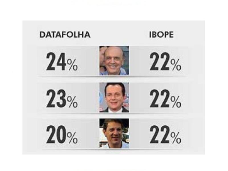 Na pesquisa Ibope divulgada também na noite deste sábado (6) há um empate numérico entre Serra, Russomanno e Haddad --todos com 22%. De acordo com o instituto, "empate triplo na véspera da eleição traz indefinição sobre quem disputará o segundo turno em São Paulo".