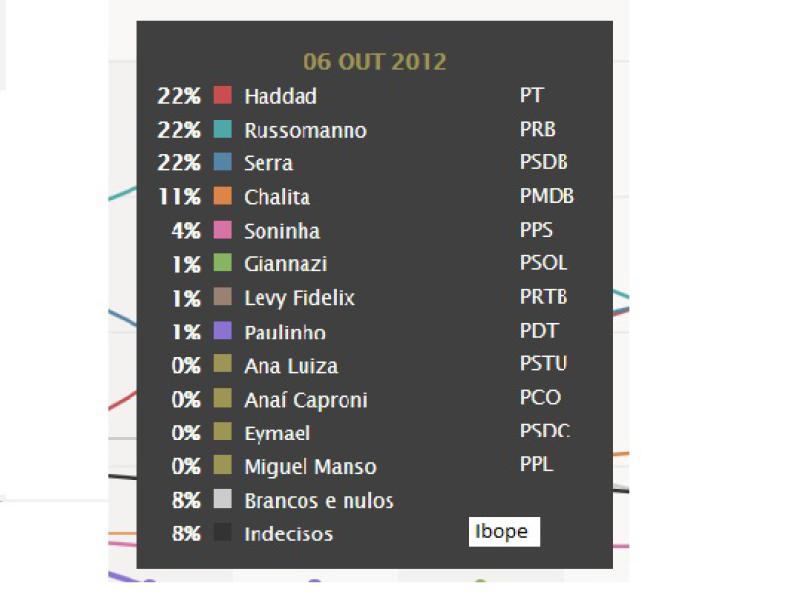 Na pesquisa Ibope divulgada também na noite deste sábado (6) há um empate numérico entre Serra, Russomanno e Haddad --todos com 22%. De acordo com o instituto, "empate triplo na véspera da eleição traz indefinição sobre quem disputará o segundo turno em São Paulo".