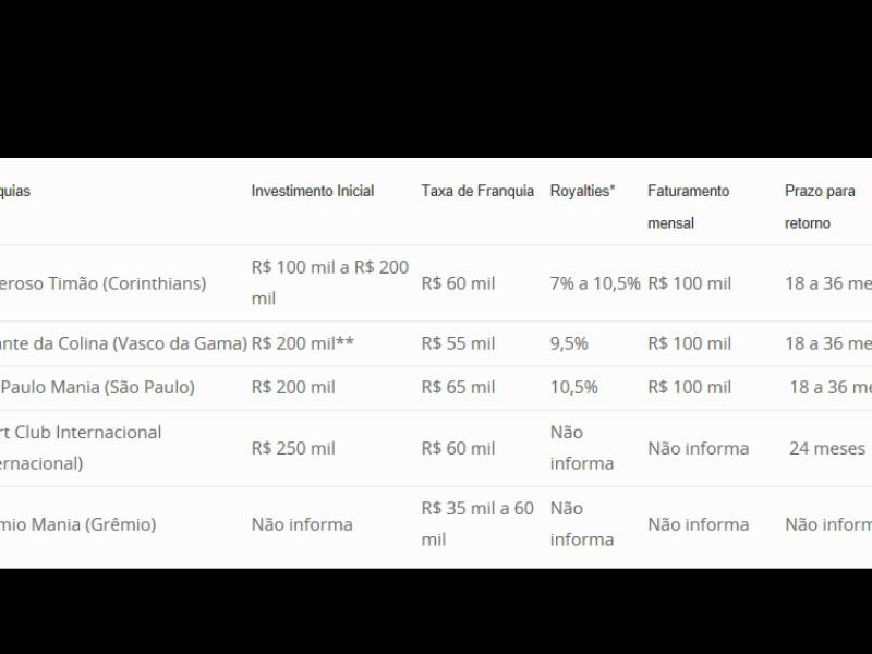 Se você quer já se interessou por este segmento e quer acertar no investimento, confira as 5 franquias de times de futebol e escolha a melhor opção para seu bolso: (Clique na foto abaixo para ampliar a informação)