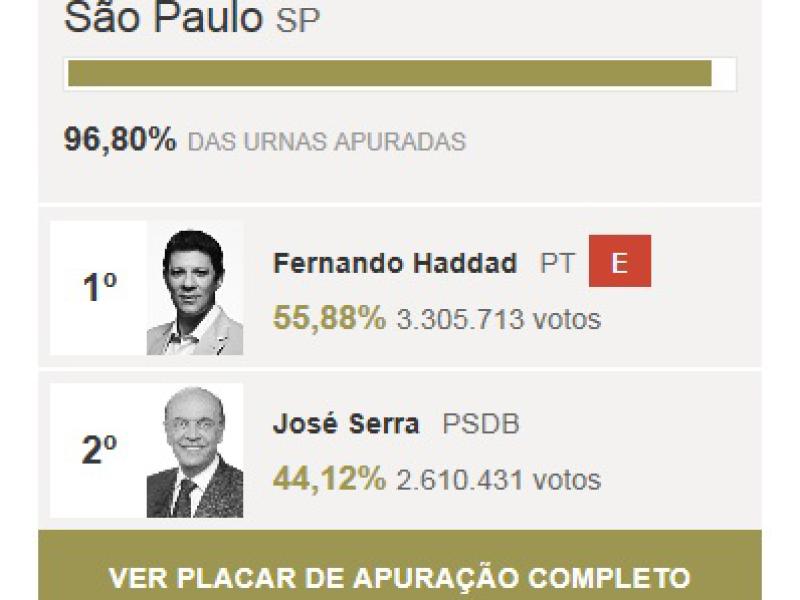 Com 93% das urnas apuradas, ele recebeu 55,94%% dos votos válidos, enquanto o ex-governador paulista José Serra (PSDB), 70, foi votado por 44,06% dos eleitores.