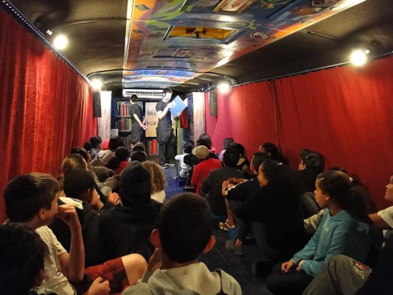 A companhia paulista se apresenta dentro de um ônibus, com ar condicionado, que comporta 55 espectadores. Nesta temporada a peça ‘Mundo Português’ conta, unindo Geografia, História e Língua Portuguesa, a história da formação da nossa língua pelo mundo através da expansão e conquistas marítimas do império português, utilizando uma linguagem divertida e bonecos de pano que saem das páginas de um enorme livro e ganham vida na imaginação das crianças.