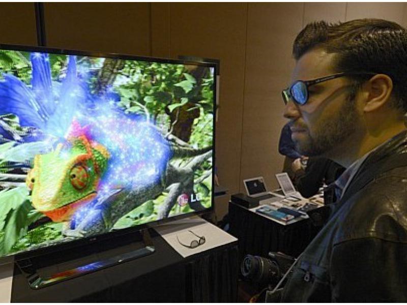 Com um óculos 3D, jornalista testa televisão da LG que tem resolução quatro vezes maior que a dos aparelhos HD atuais. Tecnologia é chamada de Ultra HD ou 4K. O modelo da LG será vendido por US$ 20 mil. (Foto: EFE/EPA/Michael Nelson)