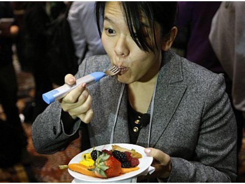 O gadget ‘HAPIfork’ conta quantas garfadas e mede a velocidade que a pessoa come. Luzes e vibração alertam quando a refeição está sendo feita rápida demais. (Foto: REUTERS/Rick Wilking)