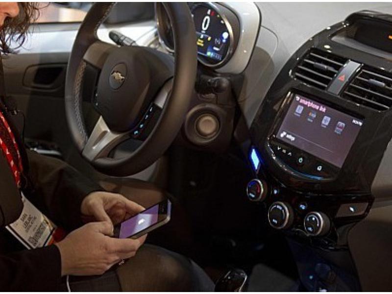 Dispositivo ‘MyLink’ instalado em um Chevrolet Spark conecta as informações de um iPhone ao veículo. Sistema sincroniza, via bluetooth, músicas, vídeos e fotos, além de fazer ligações. (Foto: REUTERS/Steve Marcus)