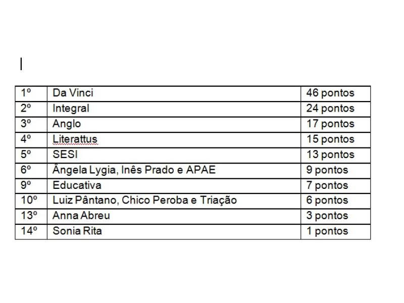 A disputa aconteceu na Academia Na Ativa e contou com provas em cinco categorias: Mirim 2 (nascidos em 2003), Petiz 1 (nascidos em 2002), Petiz 2 (nascidos em 2001), Infantil 1 (nascidos em 2000) e Infantil 2 (nascidos em 1999). A escola Da Vinci foi a campeã da modalidade, com 46 pontos na classificação geral. O Integral ficou em segundo lugar, com 24 pontos, seguido do Anglo, com 17 pontos. Confira a classificação geral (Clique na foto para ampliar a informação):