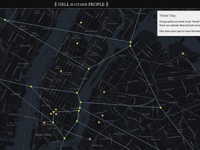O “Hell is Other People” (“O inferno são os outros”, em tradução livre), criado pelo norte-americano Scott Garner, mapeia onde estão seus amigos para que você possa ficar bem longe deles, através de seus mais recentes “check-ins” no Foursquare, rede que indica a localidade dos usuários. Com os locais frequentados por seus amigos, o aplicativo cria um um mapa com as "áreas seguras” entre você e eles.