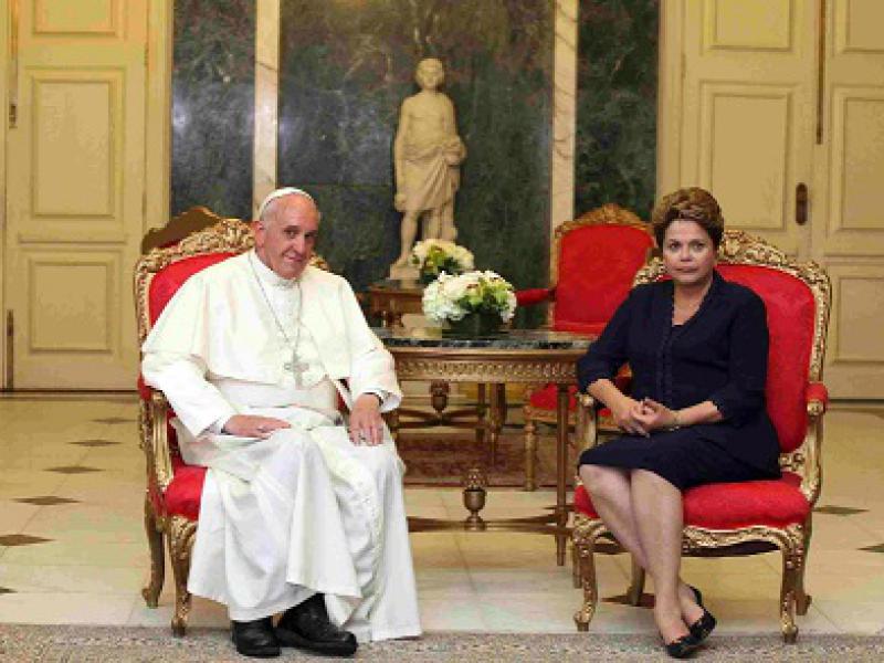 Em sua chegada ao Palácio da Guanabara, após ouvir o discurso da presidente Dilma Rousseff, o papa Francisco fez seu primeiro discurso no país, e em português.