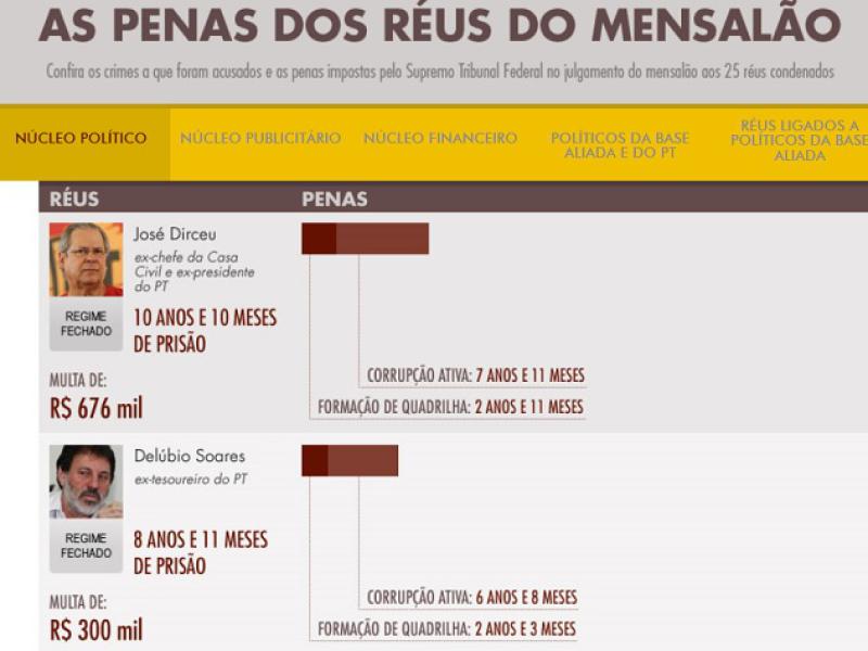 São eles: José Dirceu, ex-ministro da Casa Civil, condenado dez anos e dez meses de prisão; José Genoino, ex-presidente do PT, condenado a seis anos e 11 meses; Marcos Valério, operador do esquema, condenado a 40 anos de prisão; Cristiano Paz, ex-sócio de Marcos Valério, condenado a 25 anos 11 meses; Ramon Hollerbach, outro ex-sócio de Valério, condenado a 29 anos e sete meses; Romeu Queiroz, ex-deputado pelo PTB-MG, condenado a seis anos e seis meses; Simone Vasconcelos, ex-diretora da agência publicitária SMPB, condenada a 12 anos e sete meses; Jacinto Lamas, ex-tesoureiro do PL, condenado a cinco anos; e Kátia Rabello, ex-presidente do Banco Rural, condenada 16 anos e oito meses.