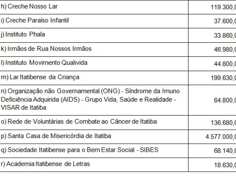 - Aprovado por unanimidade de votos o PL nº 157/2013, que “Autoriza o Poder Executivo Municipal a conceder subvenção às entidades assistenciais que especifica”. Assim sendo, ficam estipulados os valores abaixo (Clique nas Fotos para ampliar a informação), como subvenções mensais, que devem vigorar de janeiro à dezembro de 2014.