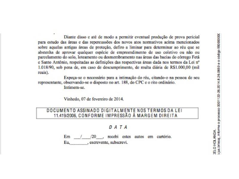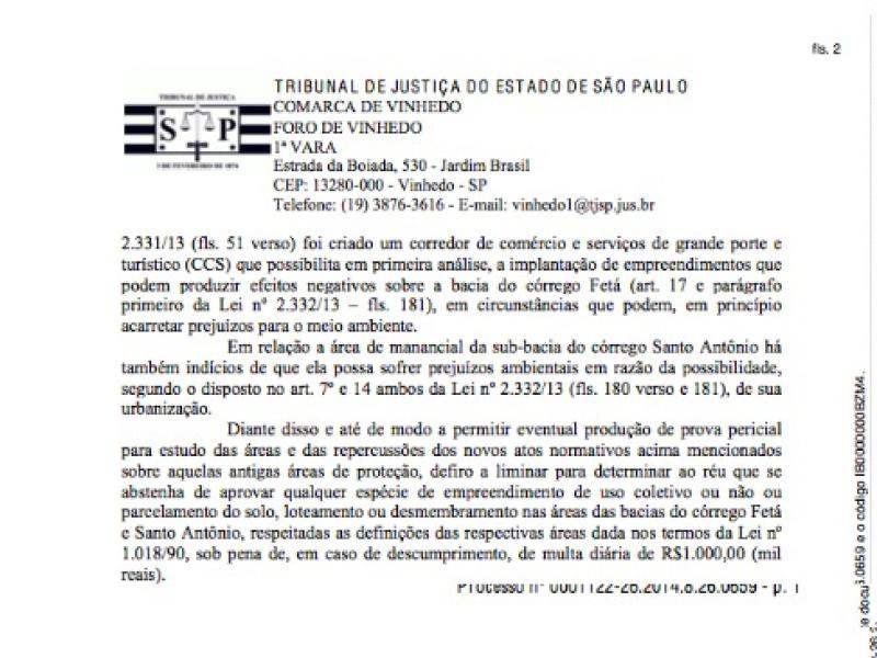 "...No final da tarde desta última segunda-feira, 10 de fevereiro, o juiz Dr. Fábio Holanda da 1ª Vara de Vinhedo concedeu liminar parcial ao pedido elaborado pela Promotoria Pública sobre o Plano Diretor de Louveira