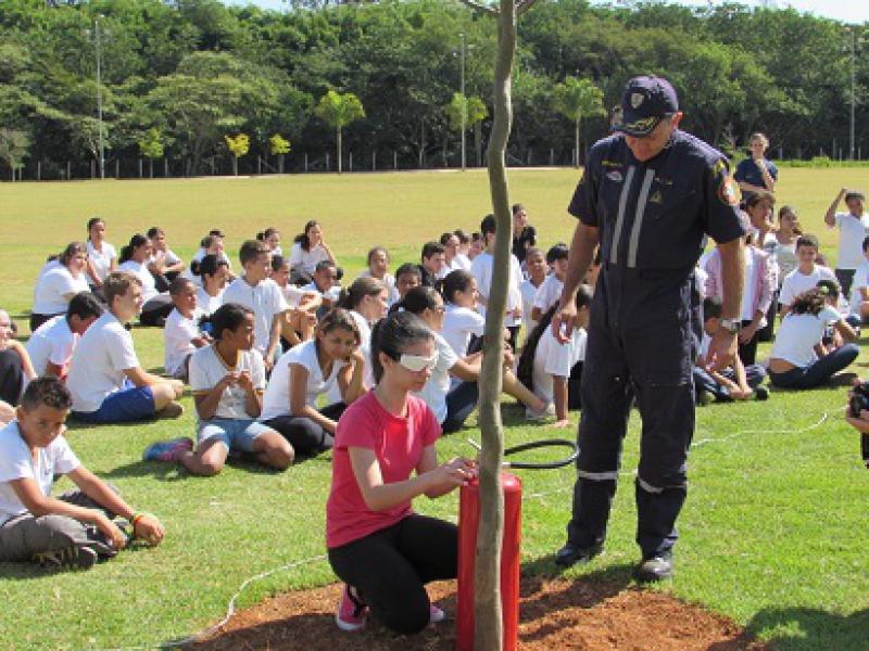 E no último sábado, dia 10 de maio, os dois grupos tiveram que por o conhecimento à prova, encontrando e identificando de olhos vendados os extintores espalhados no gramado do Parque Luís Latorre.