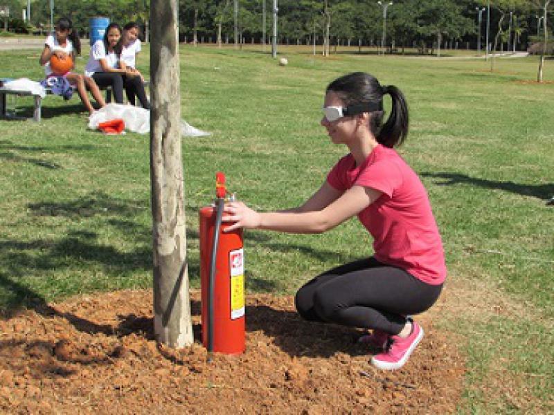 E no último sábado, dia 10 de maio, os dois grupos tiveram que por o conhecimento à prova, encontrando e identificando de olhos vendados os extintores espalhados no gramado do Parque Luís Latorre.