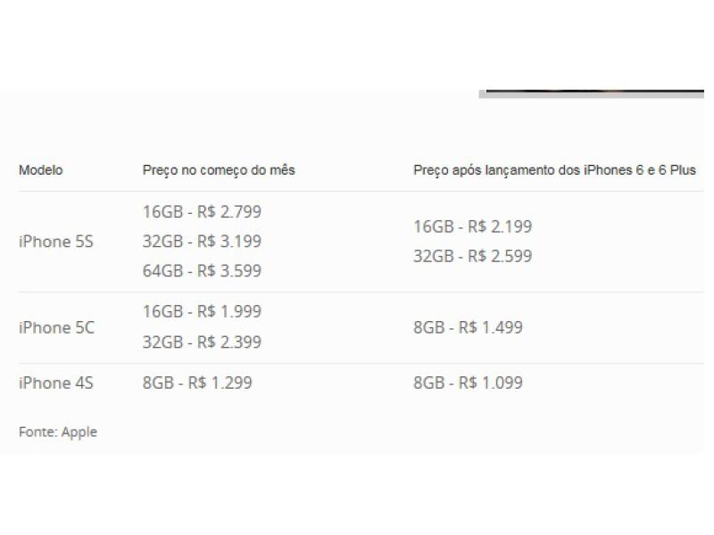 Os iPhones 6 e 6 Plus mal foram lançados nos Estados Unidos e a loja da Apple no Brasil já reduziu o preço dos smartphones no Brasil. Os valores caíram até 25%. O modelo 5C, que antes era oferecido nas versões 16GB e 32GB não estão mais na loja da empresa, agora, é vendido a versão de 8GB. Já o 5S de 64GB também deixou de ser comercializado.