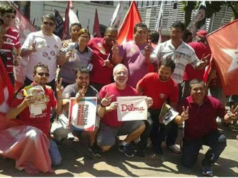 Wagner Pinheiro ainda fez pose (ao centro, agachado, segurando a bandeirinha de Dilma) ao lado dos colegas)