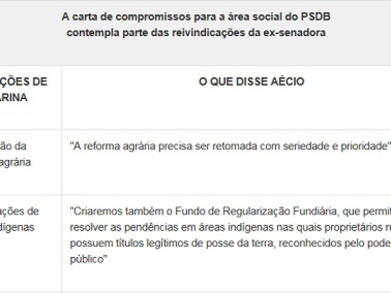 Entre as promessas assumidas pelo tucano no sábado, em resposta às condições apresentadas pela ex-senadora, está, caso seja eleito, adotar uma política ambiental sustentável, priorizar o ensino integral no país e a criar um fundo para tentar solucionar os conflitos entre índios e produtores rurais, além do compromisso de que irá trabalhar para que o Congresso Nacional aprove o fim da reeleição para cargos executivos.
