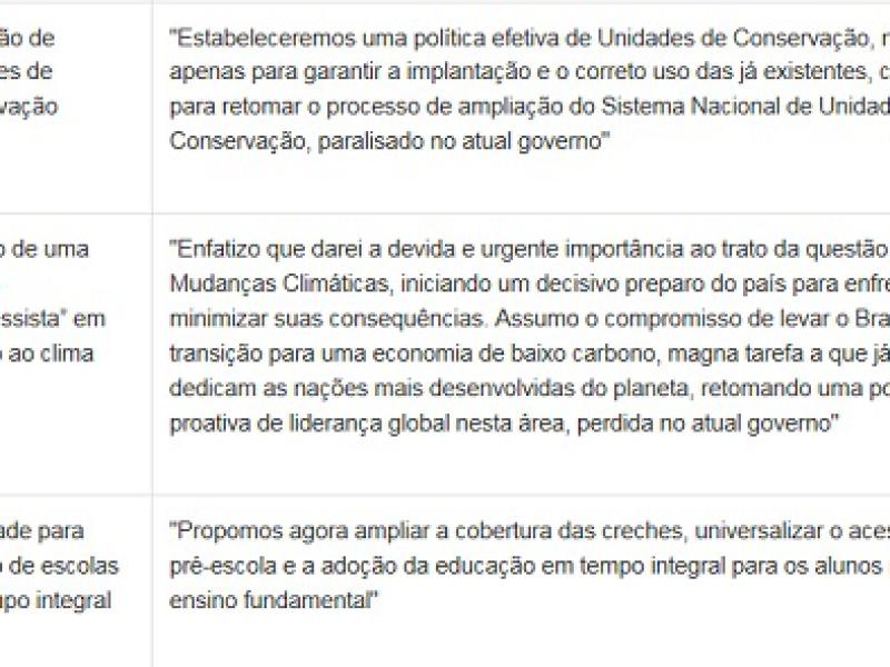 A ex-ministra do Meio Ambiente ressaltou, entre outros pontos, o compromisso do tucano de combater a discriminação; a aprovação de uma lei que transforme o Bolsa Família em programa de Estado; a promessa de buscar o desmatamento zero; a proteção dos direitos indígenas; compromisso com a educação, a saúde e a reforma agrária; e a reforma política.