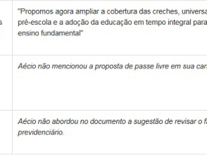 O texto divulgado pelo tucano no sábado, que ele disse que foi inspirado nas propostas divulgadas pela Rede – o grupo político da candidata derrotada do PSB –, contemplou parte das exigências de Marina. Não foram incluídas no programa tucano, por exemplo, as propostas envolvendo a gratuidade do transporte público e a reforma na regra previdenciária que inibe as aposentadorias precoces.