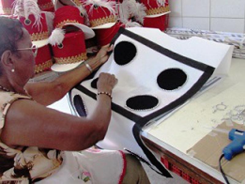 As fantasias e adereços estão em fase de produção. Voluntários e funcionários do Fundo Social de Solidariedade trabalham em conjunto para deixar tudo pronto até o dia do desfile da escola, programado para 14 de fevereiro, sábado de Carnaval, às 22h, no Parque Luís Latorre.