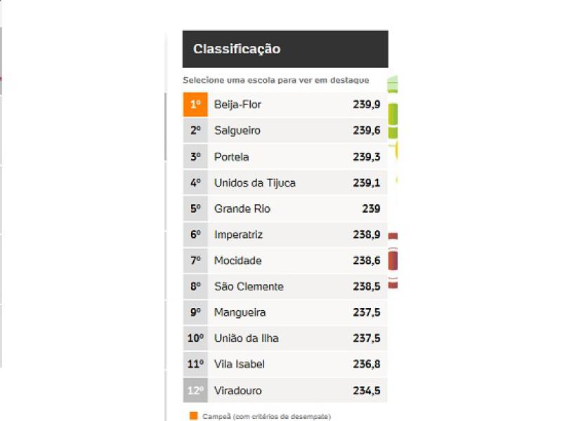 O resultado foi revelado durante apuração das notas, realizada nesta quarta-feira (18), na Sapucaí. Este é o 13º título da Beija-Flor. O penúltimo foi em 2011, com enredo sobre o cantor Roberto Carlos.