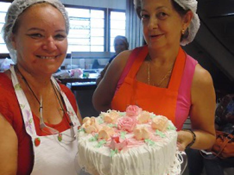 No último dia 31 de março, a cozinha da unidade recebeu a oficina de Bolo Decorado. A aula foi dada pelas professoras do FSS, Sônia Regina Boldin Bernardes e Maria de Fátima Polessi. Um delicioso bolo foi feito e ao final da aula os participantes puderam degustá-lo.