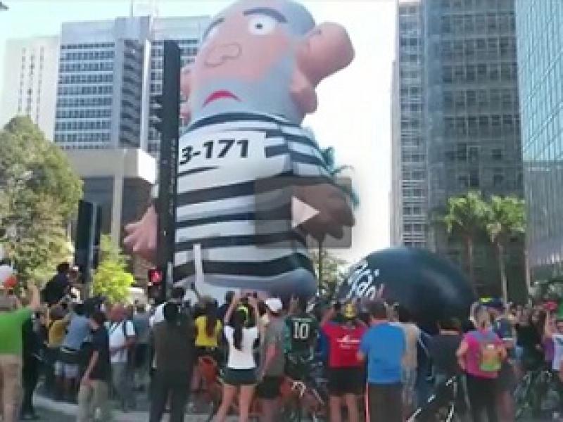 Boneco tinha sido erguido às 11h em ato contra o governo federal. PM precisou intervir depois que grupo pró-PT apareceu na avenida