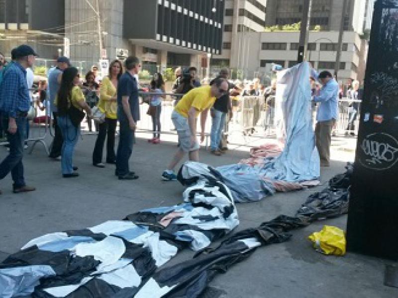 Os organizadores colocaram o Hino Nacional em um alto falante enquanto desenrolavam o boneco de plástico para começar a encher de ar. O boneco foi inflado em frente ao prédio da Caixa Econômica Federal. A Avenida Paulista não foi fechada para veículos, como aconteceu no domingo passado.