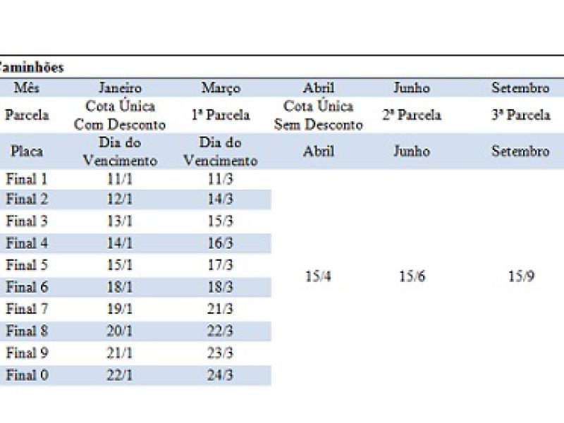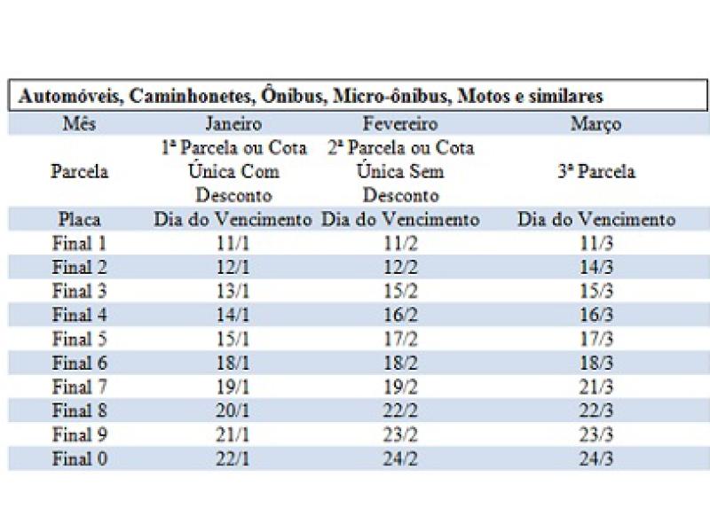 Os contribuintes podem pagar o imposto em cota única no mês de janeiro, com desconto de 3%, ou parcelar o tributo em três vezes (nos meses de janeiro, fevereiro e março), de acordo com o final da placa do veículo. Também é possível quitar o imposto no mês de fevereiro, sem o desconto.
