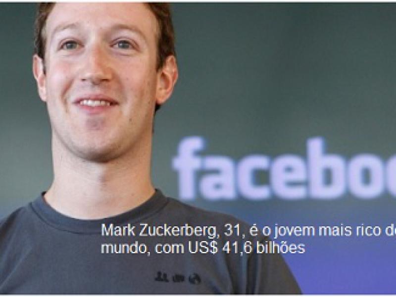O primeiro lugar é ocupado pelo norte-americano Mark Zuckerberg, 31, um dos fundadores da rede social Facebook, com patrimônio avaliado em US$ 41,6 bilhões (cerca de R$ 153,8 bilhões).