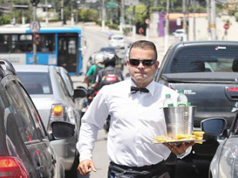 Depois de ficar meses desempregado, Jairo Rosendo de Freitas, 34, decidiu vender água e amendoim na av. Interlagos, zona sul de São Paulo, vestido como garçom. (Fonte: Reinaldo Canato/UOL)