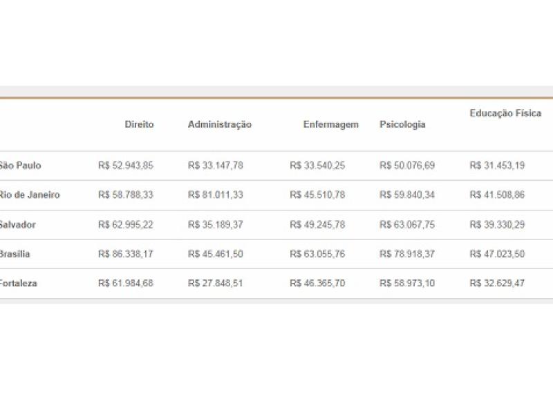 O relatório, que traz os dados do primeiro semestre de 2016, apresenta o preço médio dos cinco cursos mais buscados em todo o Brasil (Direito, Administração, Enfermagem, Psicologia e Educação Física), assim como, as diferenças de valores entre as cinco principais cidades em que o programa atua: São Paulo, Rio de Janeiro, Salvador, Brasília e Fortaleza.