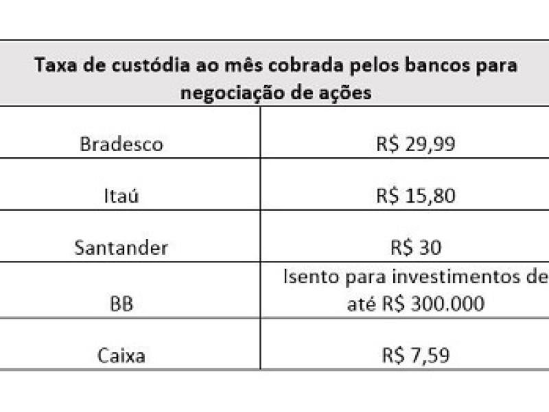 Além das taxas do Tesouro Direto, quem investe em ações e opções pelo banco e pela maioria das corretoras também paga taxa de custódia mensal. Veja quanto cobram os grandes bancos pelo serviço:
