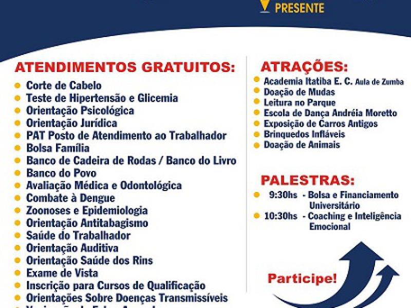Conforme informa a assessoria da cidade de Itatiba, a partir das 9h, o Rotary Club e a Prefeitura de Itatiba se unem para oferecer uma série de serviços gratuitos e de qualidade, como: corte de cabelo, teste de hipertensão e glicemia, orientação psicológica, orientação jurídica, banco de cadeira de rodas, banco do livro, banco do povo, avaliação médica e odontológica, orientação antitabagismo, saúde do trabalhador, orientação auditiva, orientação saúde dos rins, exame de vista e inscrições para cursos de qualificação.