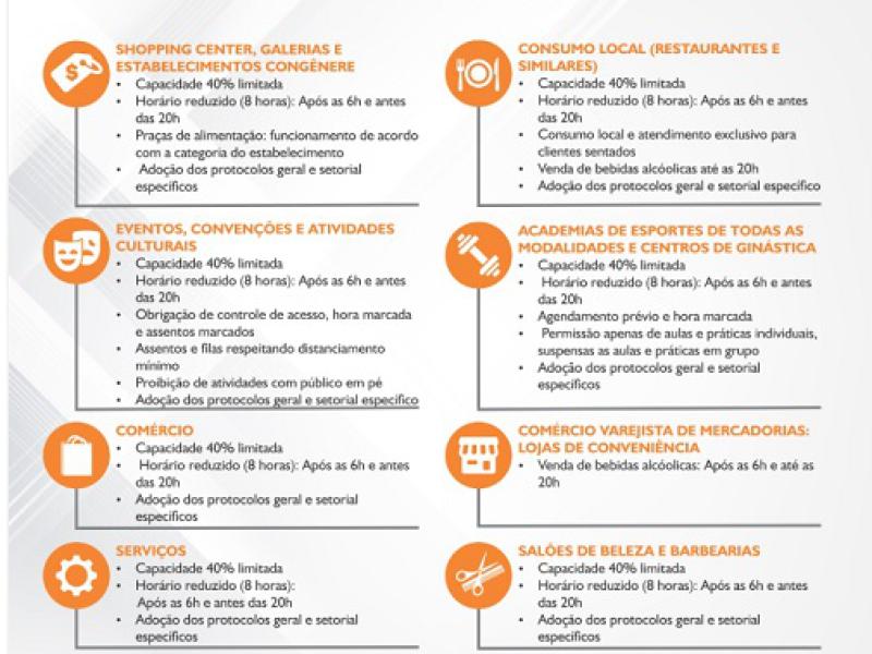 • Praças de alimentação: funcionamento de acordo com a categoria do estabelecimento. Adoção dos protocolos geral e setorial específicos.