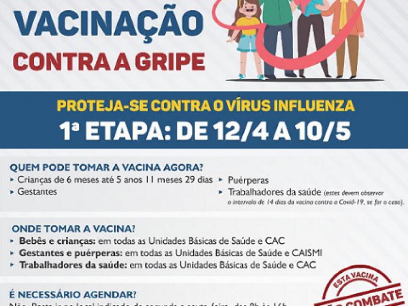 A vacina contra gripe protege contra infecções respiratórias causadas pelo vírus Influenza, que acomete o aparelho respiratório, podendo evoluir para doenças mais perigosas, como a pneumonia. A campanha de vacinação contra gripe é coordenada nacionalmente pelo Ministério da Saúde e tem duração de quatro meses, dividida em três etapas. A próxima etapa prevista deverá atender idosos e professores, a partir de 11/05. E em junho passam a ser vacinados contra gripe para demais públicos." (Fonte: ACPMI)
