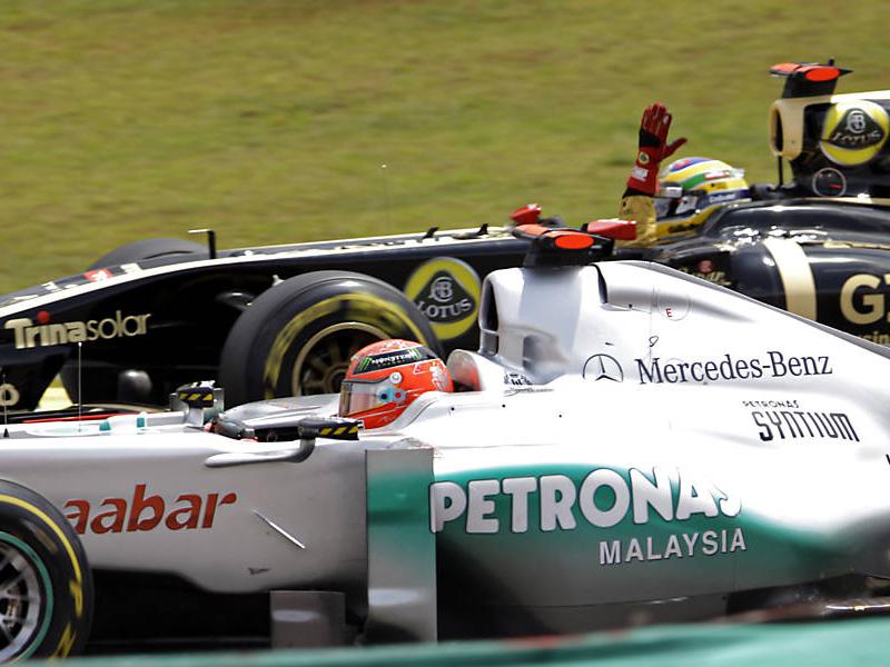 Numa tentativa de defender a posição, Bruno Senna tocou o bico da asa dianteira na roda esquerda traseira do rival. Schumacher levou o carro com o pneu furado até a área dos boxes. Já o piloto da Renault continuou na pista (parou três voltas depois) sem grandes avarias no carro, mas foi punido com um drive-through.