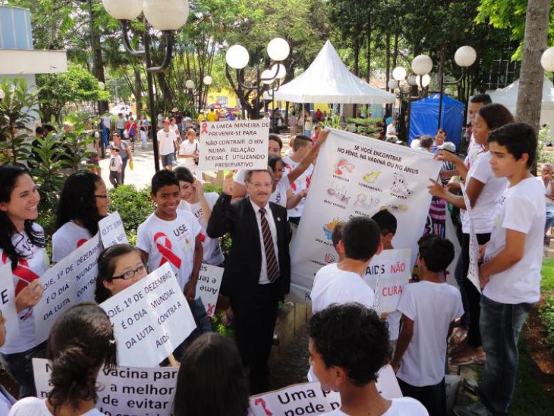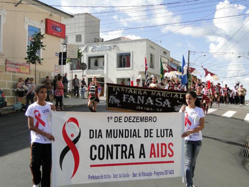 caminhadas pelo centro da cidade levando cartazes informativos sobre o HIV e a importância dos métodos de prevenção.
