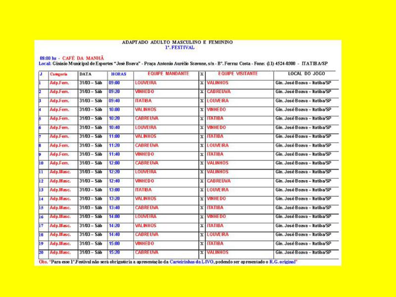 A equipe Adulta feminina da Livo/PMI/Unimed de Itatiba fará sua estréia às 18h contra a equipe da Unicamp/Campinas. As seleções de voleibol adaptado de Itatiba jogam no período da manha e no começo da tarde. A entrada é franca.