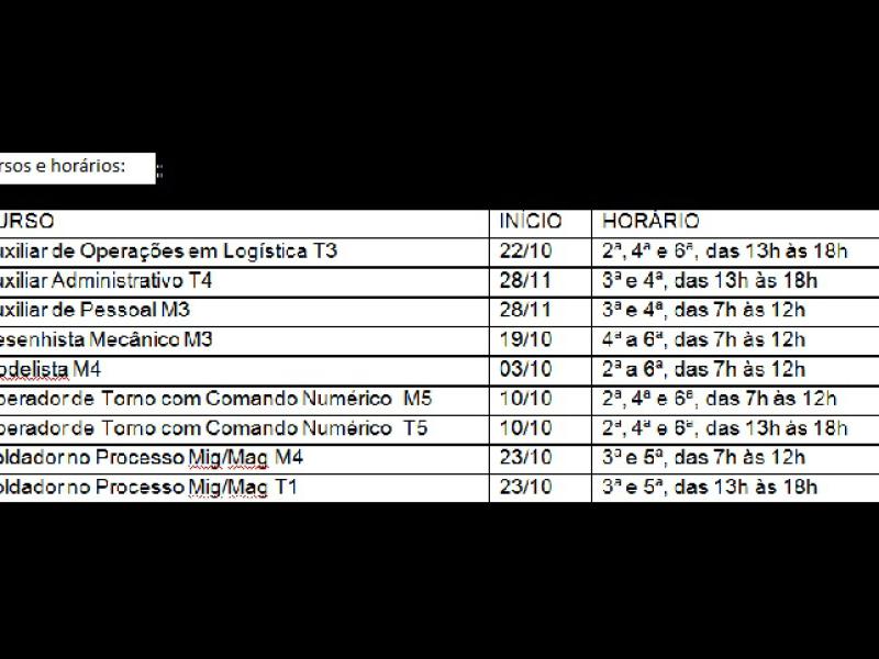 Há vagas para os cursos de Auxiliar de Operações em Logística, Auxiliar Administrativo, Auxiliar de Pessoal, Desenhista Mecânico, Modelista, Operador de Torno com Comando Numérico e Soldador no Processo Mig/Mag. Os interessados, maiores de 16 anos, podem realizar a pré-matrícula nos Centros Comunitários, CRAS ou Secretaria de Ação Social, Trabalho e Renda. Os participantes terão direito a auxílio transporte e lanche e ao final do curso receberão o Certificado de Qualificação Profissional do SENAI. Mais informações pelo telefone 4524-2984.