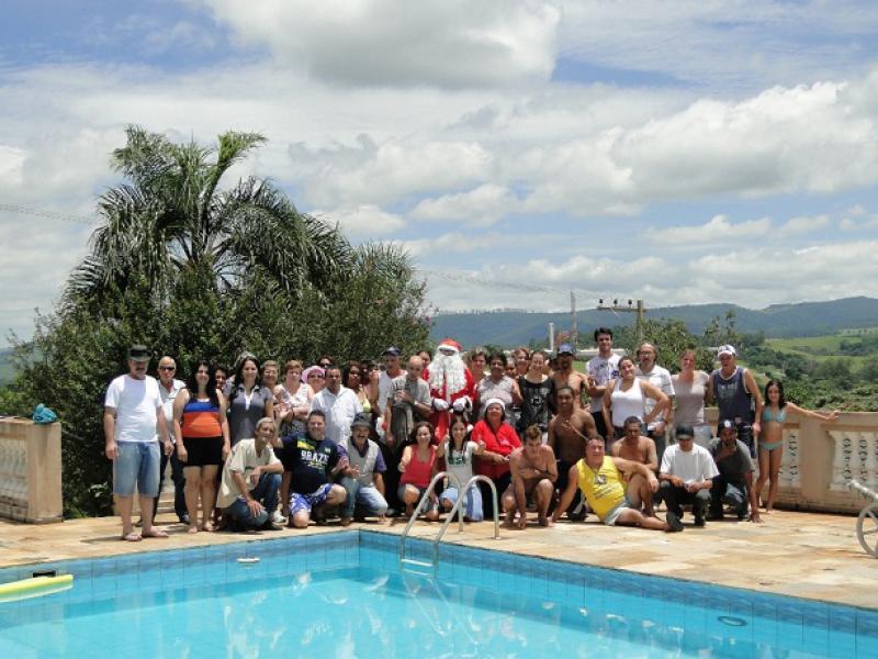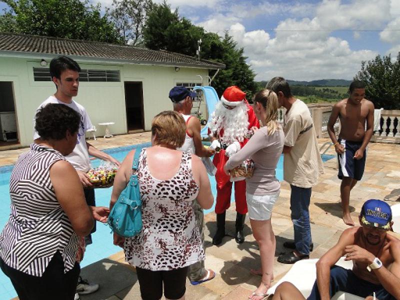 O evento aconteceu em uma chácara e contou com churrasco, piscina, música ao vivo e até a visita do Papai Noel
