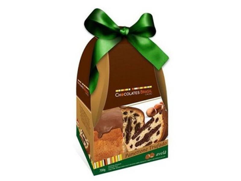 O panettone, além de ser recheado com doce de leite, possui também gotas de chocolate.
