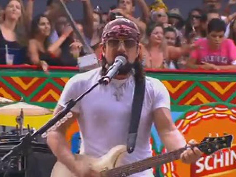 "Eu sabia que ia ser um dia diferente, e eu não me preparei. Peguei minha guitarra e vim", disse de frente a um camarote onde os convidados seguravam uma máscara do artista na mão. "Estou encantado com minha primeira saída solo, com o carinho que vocês estão me dando. Eu tinha certeza do que eu queria". (Fonte: UOL/ Tiago Dias)