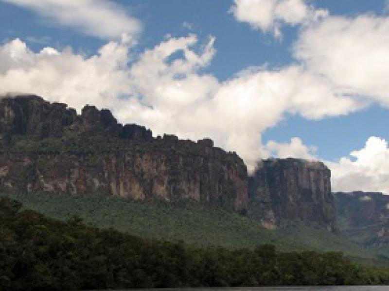 Após uma grande curva, surge Auyantepuy, um dos maiores tepuis do Parque Nacional de Canaima, que começa a revelar o motivo de todo o esforço: o Salto Angel.