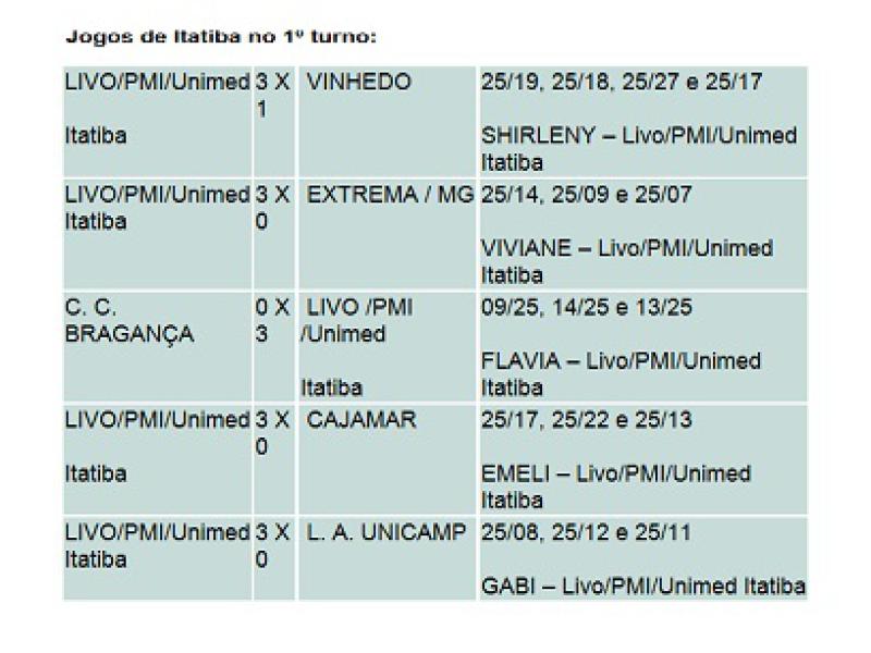 A equipe adulta da Livo/PMI/Unimed Itatiba jogou contra a equipe da Liga das Atléticas da Unicamp (L.A. Unicamp) e venceu com muita facilidade por 3 x 0, com parciais de 25/08, 25/12 e 25/11, em apenas 54 minutos de uma partida totalmente dominada pela equipe comandada pelo Técnico Ban. Com mais esta vitória, as Itatibenses terminam o 1º turno na liderança do grupo de forma invicta, com cinco vitórias em cinco jogos.