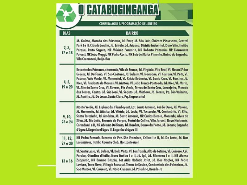 Outra ação importante é a volta do Catabugiganga, que já está circulando pela cidade e recolhendo materiais inservíveis depositados irregularmente nas ruas. A Prefeitura elaborou um cronograma para divulgar em quais dias e bairros os caminhões do Catabugiganga estarão nesse mês de janeiro.