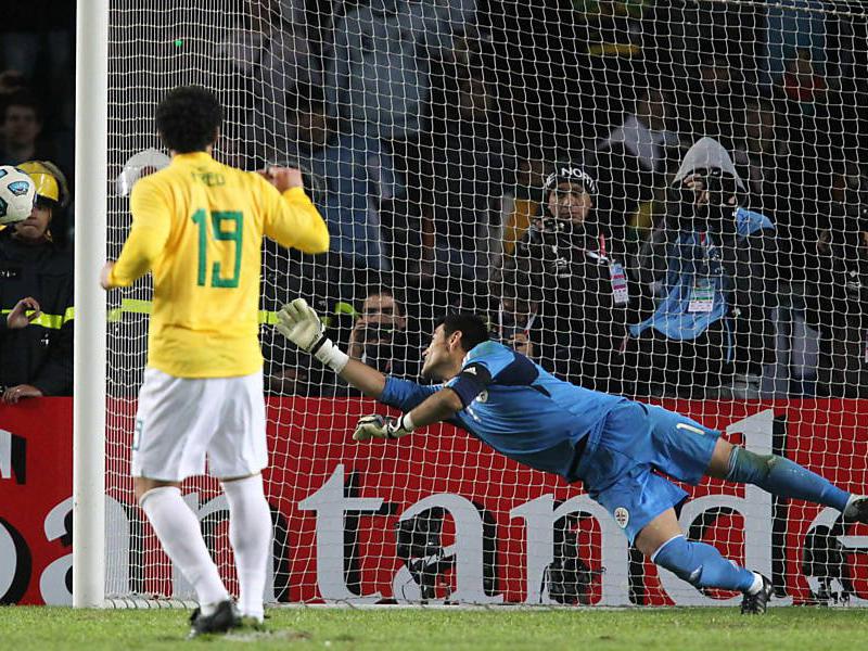 Estava tudo nas mãos de Fred. Ele precisava fazer o gol para manter o Brasil na disputa. E, seguindo o exemplo de seus colegas, incrementou o vexame também batendo para fora. O Brasil, após parar nas mãos de Justo Villar foi eliminada de forma ridícula da Copa América.(Fonte: Joven Pan Oline/ por Danilo Meira/Folha)